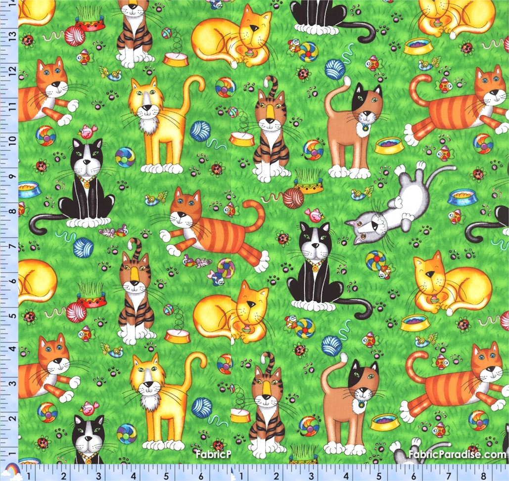 Whimsical Cats on Green - SALE! (MINIMUM PURCHASE 1 YARD), Cats, Elkabee's FabricParadise.com, LLC