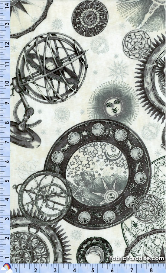 Stargazing - Celestial Symbols with Silver Highlights on Gray, Celestial, Elkabee's FabricParadise.com, LLC