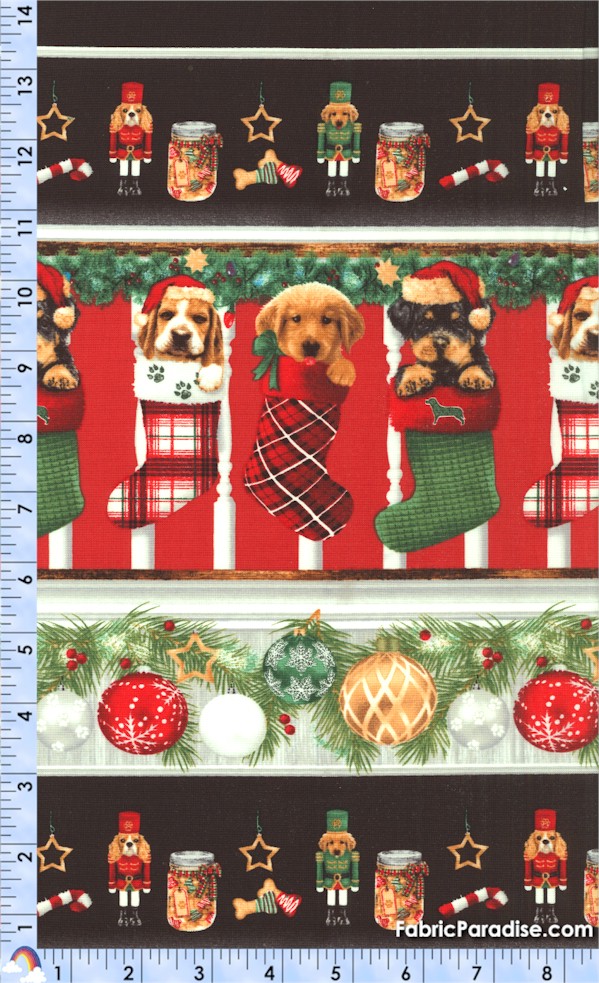 This adorable print features stripes of the the cutest pups peeking out of Christmas stockings, ornaments, dog biscuits, and -- our favorite part -- little puppie nutcrackers! Please note that the stripe runs the LENGTH of the fabric (i.e. PARALLEL with the selvedges)