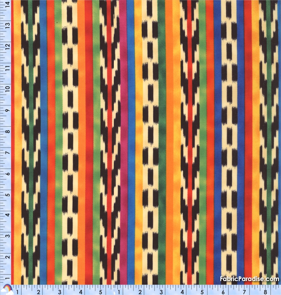 This colorful Guatemalan-style stripe features alternating vertical stripes in a variety of widths and colors, including orange, green, blue, yellow, and red. Also featured are geometric shapes like squares and rectangles in contrasting colors. This would make a beautiful quilt, throw pillow, apron, table runner, or skirt.
