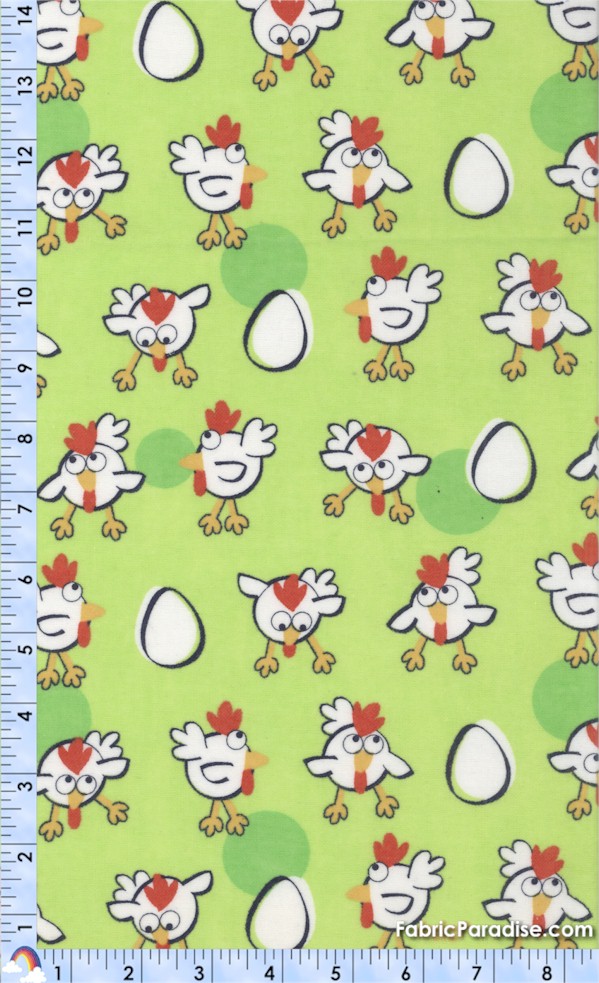 This cute flannel features rows of hens and eggs on lime green cozy flannel. Makes a great quilt, pj’s, pillowcases...you name it!
