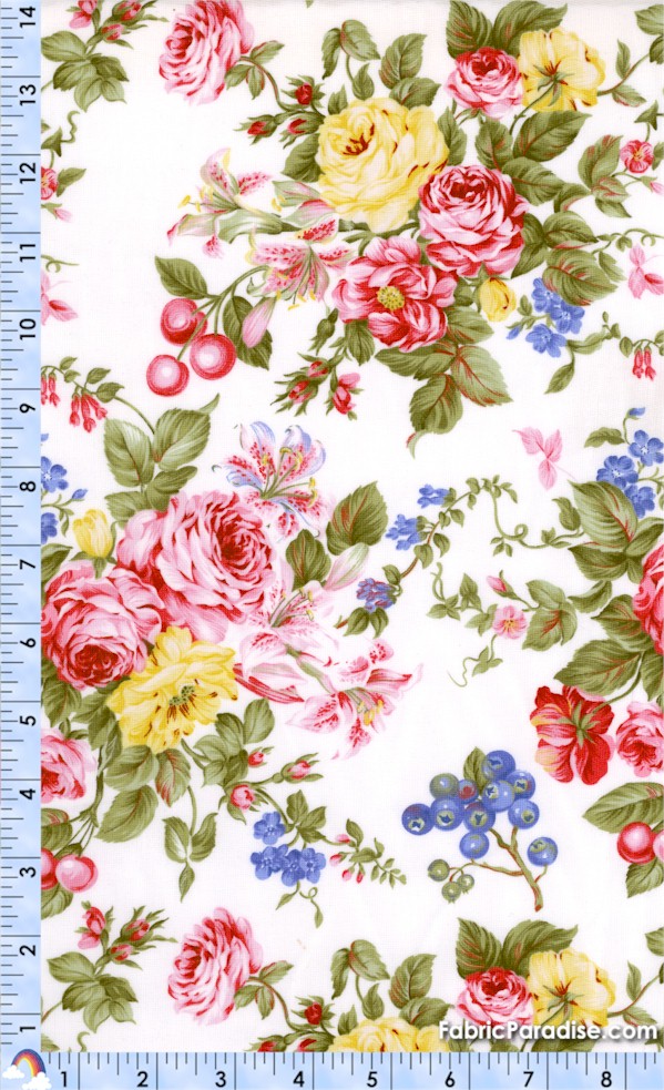 This romantic, painterly print features tossed bouquets of roses, wildflowers and berries on an ivory background. This is an exquisite fabric for quilting and home decorating.