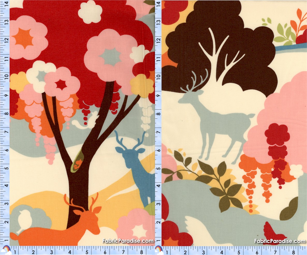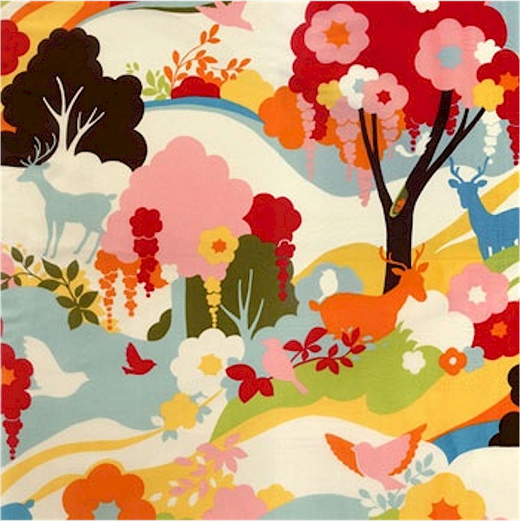 This colorful print features forest scenes of trees, flowers, birds and deer in retro colors with a modern flair! Beautiful for a quilt, curtains, or apparel!