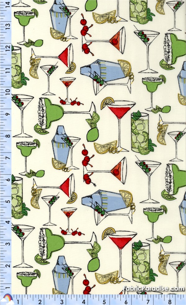 This fun print features all kinds of cocktails, including martinis, margaritas and mixed drinks as well as lemons, limes, cherries and cocktail shakers...a bartender’s dream! A great fabric for a quilt, table runner or apron!