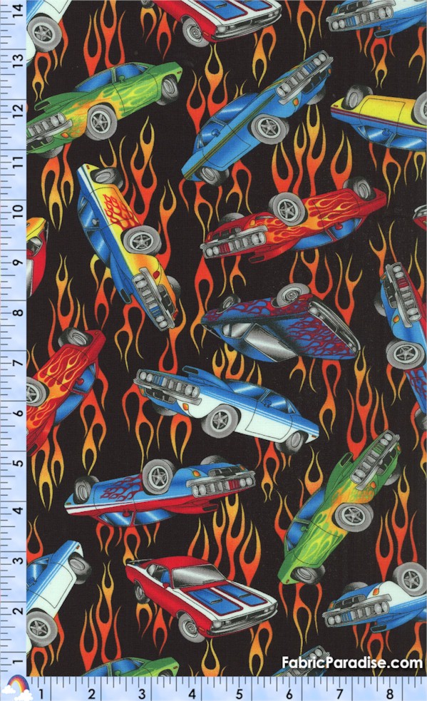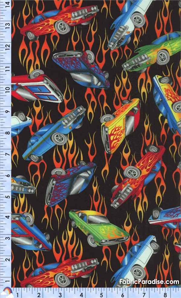 This eye-catching print features classic sportscars in vivid colors on a red-hot flame background. Please click on the ’optional image’ link below the picture to see more of this fabric.