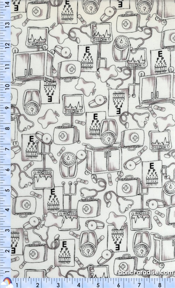This fun print by Loralie features all the necessary accoutrements of the medical profession - stethoscopes, bandages, monitors, scales, eye charts, headlamps, hot water bottles and more! Great fabric for a quilt, pillowcase, apron, tote bag or scrubs.