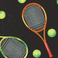 Tossed Tennis Racquets and Balls on Black - SALE! (MINIMUM PURCHASE 1 YARD)